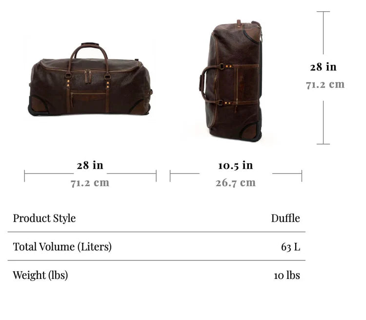 The Theodore Leather Large Roller Duffle is artisan-crafted with our hand-selected Espresso finish extremely durable full-grain pebbled US steerhide leather. This rolling duffle bag is exquisitely appointed with chocolate full-grain chrome tanned leather accents and solid copper rivets at all stress points.